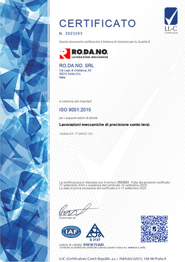 Ro.Da.No. Srl ha conseguito la prestigiosa certificazione internazionale ISO 9001:2015, avendo raggiunto con successo lo standard per il sistema di gestione per la qualità nel settore delle lavorazioni meccaniche conto terzi.